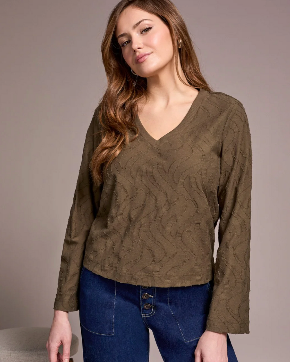 There is no reason you can't look good and feel comfortable with this textured jacquard top. The design pairs a graceful V-neckline and flowing bell sleeves, in a deep ivy green hue. It is a style and color that will be a wonderful addition to your fall wardrobe. The unique jacquard fabric adds a visual interest to an otherwise basic t-shirt.