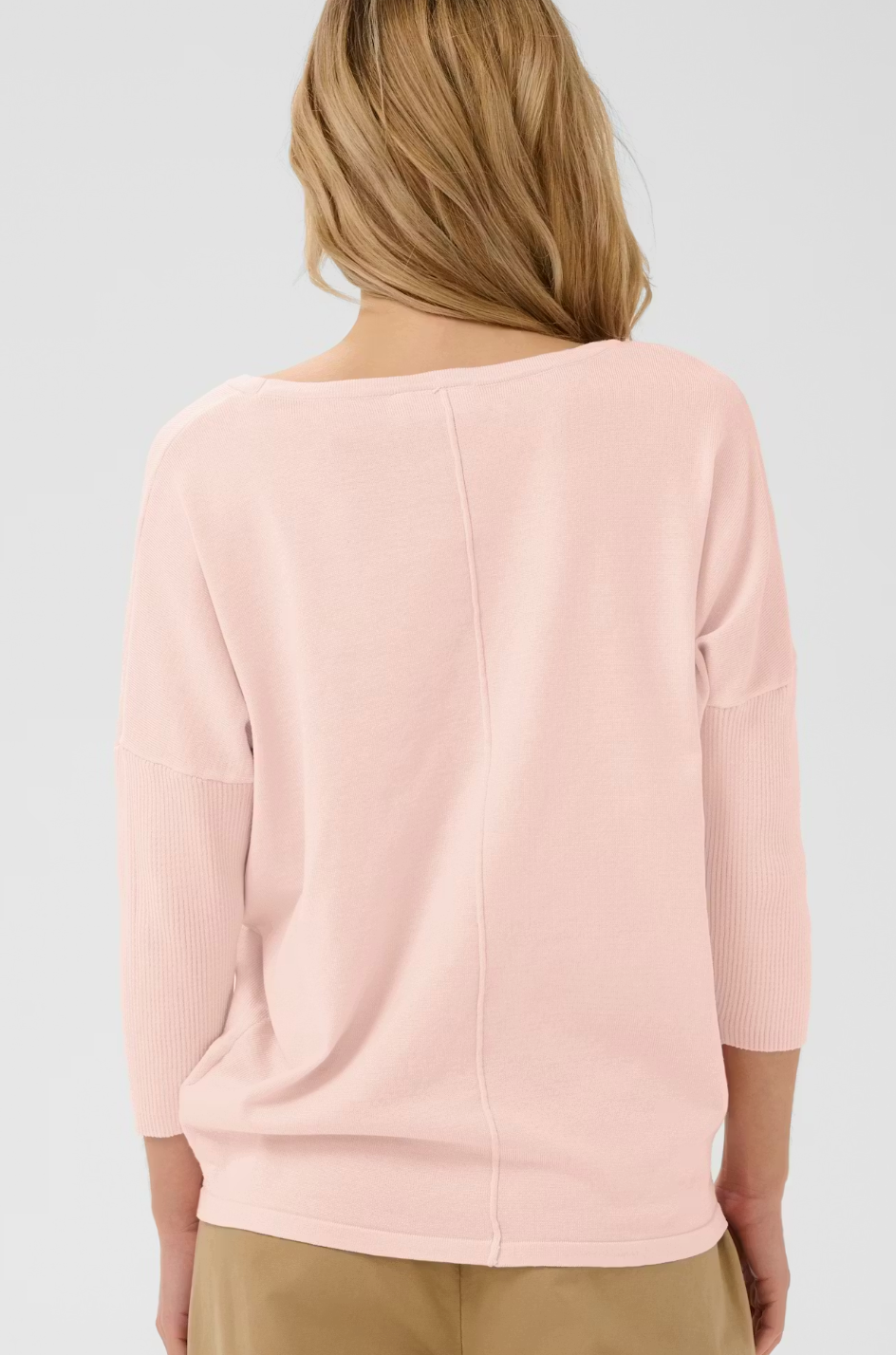 Knitted round neck, casual relaxed fit pullover with 3/4 length sleeves and ribbed trim. Available in soft pink and pearl grey.